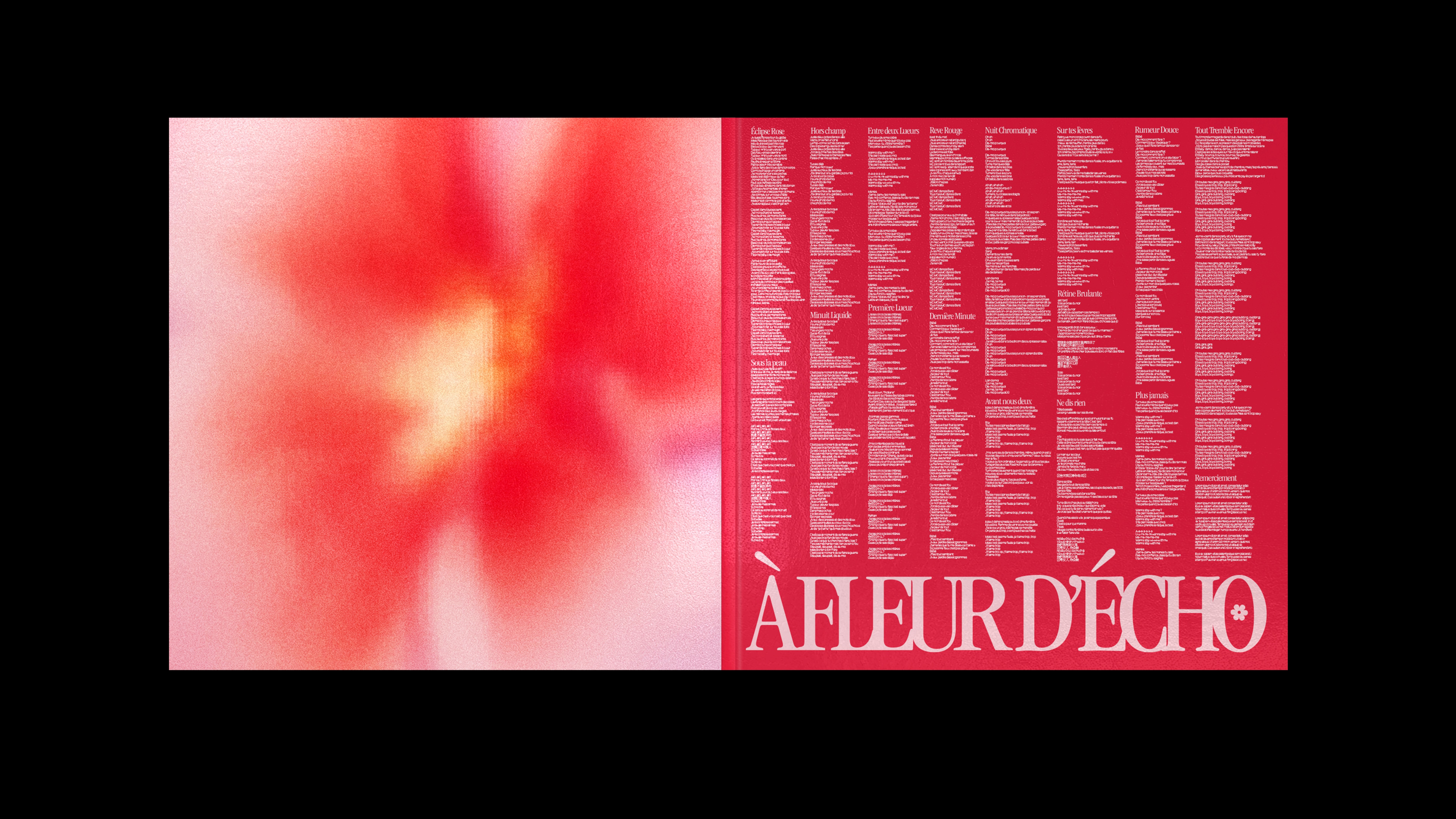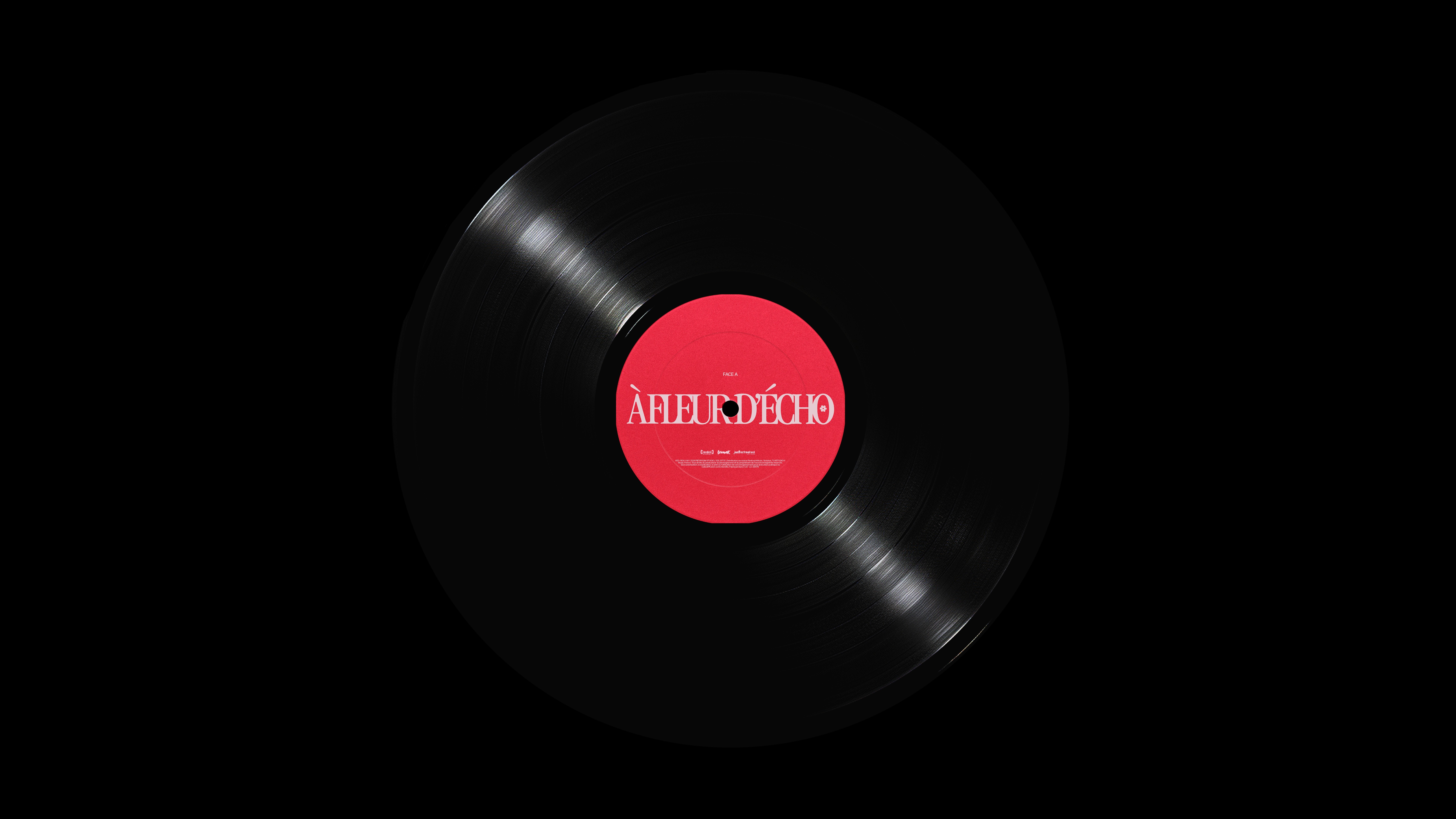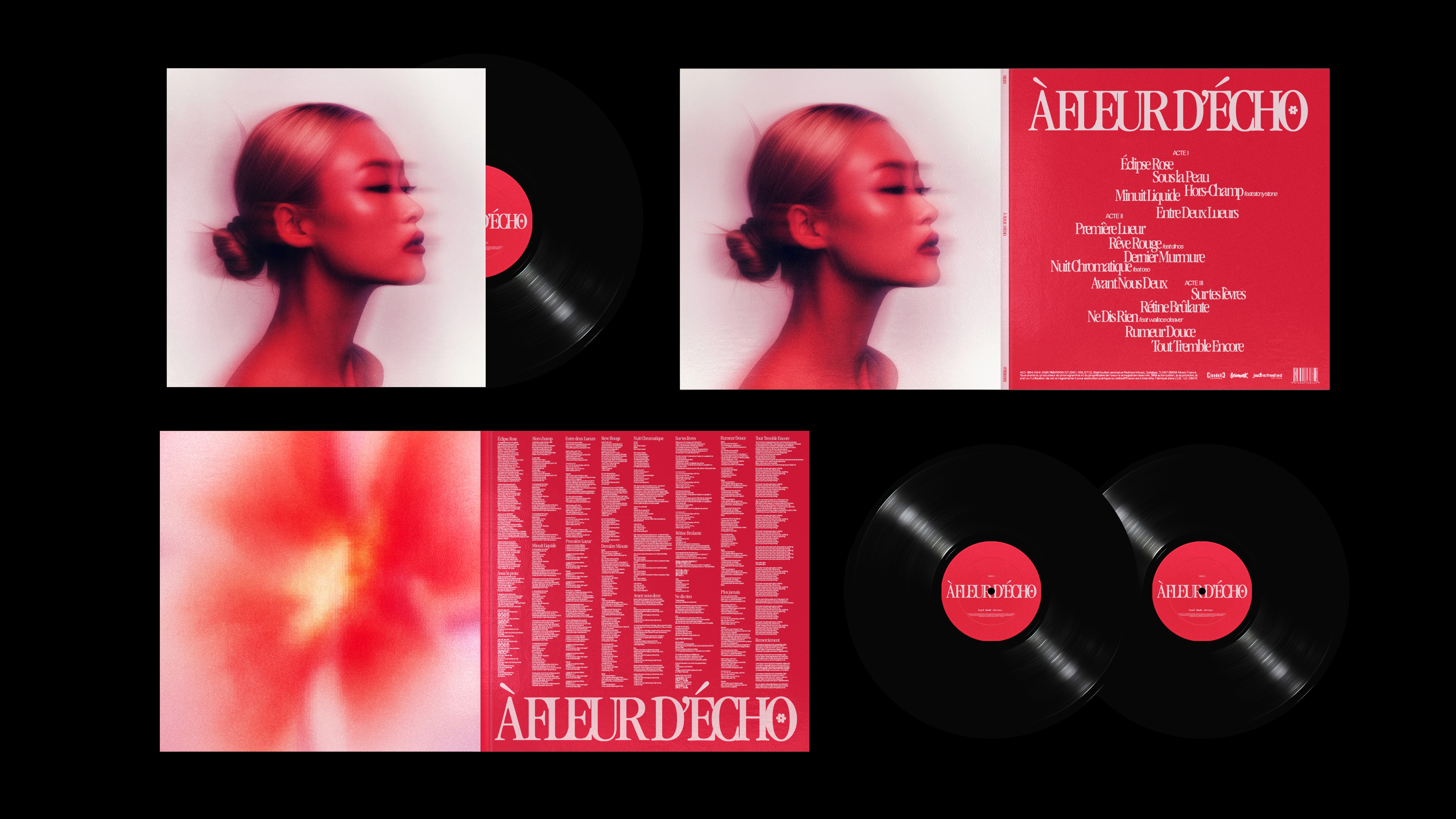 Pour ce projet, j’ai développé une identité centrée sur l’idée d’écho, sur ce qui persiste, se superpose et laisse une trace. Le portrait n’est pas traité comme une figure frontale mais comme une silhouette en mouvement, volontairement dédoublée pour évoquer la sensation plutôt que l’individu. J’ai travaillé un univers chromatique composé de rouges et de roses saturés, pensés pour créer une densité visuelle immédiate. Cette palette installe un ton clair, à la fois chaud, direct et légèrement instable. Le flou subtil apporte une texture qui rythme l’ensemble sans basculer dans un registre trop symbolique. Côté graphisme, j’ai structuré la typographie de manière éclatée, avec des titres organisés en blocs dynamiques qui semblent se répondre entre eux, comme un écho graphique. Le choix d’une fonte étirée renforce la présence visuelle tout en conservant de la légèreté dans la composition. L’album est divisé en actes, une manière d’apporter une structure simple et lisible à l’ensemble tout en maintenant une cohérence esthétique. Le vinyle s’intègre naturellement dans la direction artistique, traité comme une extension matérielle du concept. Pour enrichir l’univers, j’ai imaginé la présence de quelques feats cohérents avec cette atmosphère avec des artistes que j’écoute beaucoup en ce moment et qui pourraient, dans un projet réel, pousser encore plus loin le ton et la sensibilité de l’album. @stonystone @dinospichichi @osolea.fr@wallacecleaver